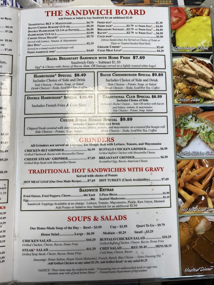Includes Choice of Side and Drink. Side Choices - Potato, Soup, or Salad. Drink Choices - Soda, Iced/Hot Tea, Coffee